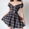 The dress showcases a timeless plaid pattern, adding a touch of vintage flair to your ensemble. The off-shoulder neckline highlights your shoulders and collarbones, creating an alluring and romantic look. The elasticized neckline ensures a secure and comfortable fit, allowing you to move with ease while maintaining the dress’s flirty appeal.
